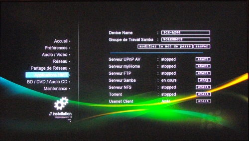 - Section application. Tout comme les autres NMT (ou NMJ maintenant), le A210 peut se comporter en serveur et faire tourner des applications. Elles sont de base au nombre de 6. On retiendra plus particulièrement le service SAMBA pour voir le disque de votre appareil comme un disque réseau à partir de vos ordinateurs. A savoir que sur les précédents firmware il fallait systématiquement utiliser un disque interne pour faire fonctionner ces applications. Maintenant, il es possible d’utiliser un périphérique USB externe (une clé USB par exemple).