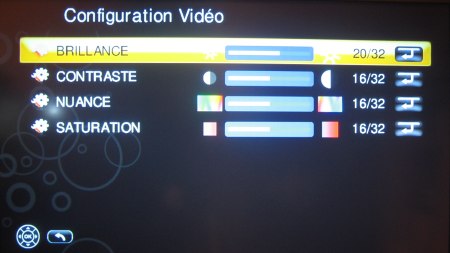 Un écran permet de régler la luminosité, contraste, nuance et saturation sur 32 paliers.