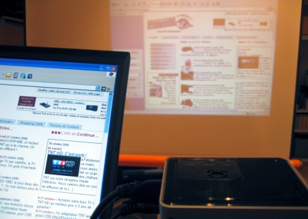 Nous avons tout d’abord raccordé notre PC portable EEEPC de Asus. Le EEEPC appartient au monde des Netbook, des PC aussi petits qu’un livre et qui proposent un écran de 7 pouces. Idéal pour travailler n’importe où, ce type d’ordinateur est également à même de lire des vidéos.