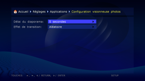 Dans certains cas, vous pourrez ajuster certains paramètres. Ajuster le temps de diffusion d’une image dans la visionneuse de Photos, lancer la recherche des chaines TNT ou encore mettre en route le serveur de fichier.