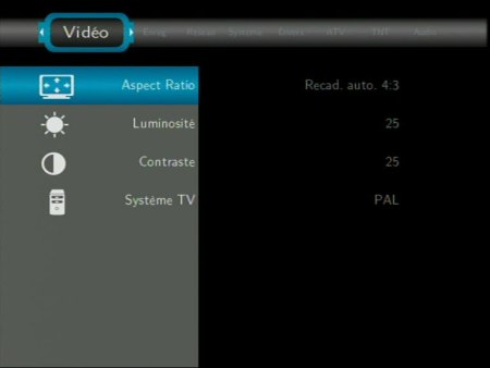 - Video donne accès à des réglages de luminosité ou contraste mais plus essentiellement à celui de la sortie vidéo. Les modes NTSC, PAL, 480p, 720p 50hZ, 720p 60Hz, 1080i 50Hz et 1080i 60Hz sont disponibles. L’appareil n’est donc pas compatible full HD en mode progressif