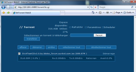 La partie communication comprend également le service Bittorrent. Une fois lancé, vous pouvez ajouter à partir de votre ordinateur via votre navigateur internet des Torrents correspondant à des fichiers à télécharger.