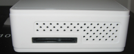 En fait, il s’agit d’un connecteur SATA (contrôleur et alimentation) de type interne ! Vous pouvez à l’ide du petit câble livré brancher un disque dur externe ou encore un lecteur DVD sans utiliser de boîtier.