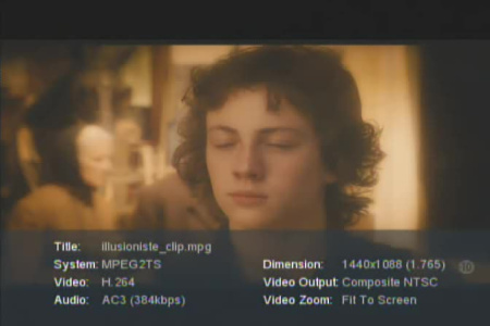Quelques informations peuvent être affichées à l’écran pour mieux connaître les caractéristiques du fichier en cours de lecture (codec/Audio/Dimension).