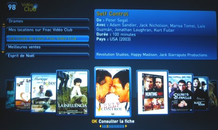 - 98, la chaîne Vidéo club. Un catalogue de plus d’un millier de film y est disponible. Ces films sont répartis en 11 catégories.