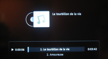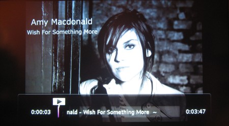 Une fois entré par le clavier virtuel la recherche (par exemple Amy McDonald), un nouveau choix est ajouté pour rechercher les vidéos portant ce critère. Il est possible de choisir la vidéo à lancer tout en profitant d’une miniature en illustration.