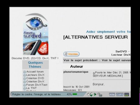 Les pages s’affichent avec une résolution réduite de l’ordre de 640 * 480 pixels. La navigation s’effectue avec les 4 touches directionnelles et les liens hypertextes s’affichent en sur lignage jaune pendant le déplacement. Une touche Retour pour consulter la page précédente et Home pour revenir au menu de navigation principal est disponible sur la télécommande.