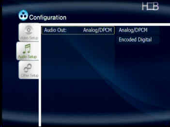 Le second onglet offre le réglage de la sortie audio. Elle peut être de type analogique (stéréo uniquement) ou mieux numérique si vous avez un ampli compatible Dolby Digital (ex AC3) une entrée coaxiale. Cette fonctionnalité est intéressante dans un mode home cinéma : de plus en plus de films DivX/XviD comportent une piste audio AC3 pour restitution sur 6 enceintes. Notre ampli Pioneer VSX 808 nous a permis de vérifier le bon fonctionnement de cette sortie.