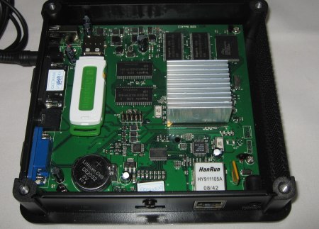 Aucune place n’est prévue pour intégrer un disque dur. La carte mère est dépourvue de ports SATA ou IDE.
