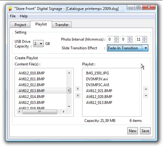 - Le second onglet, Playlist donne la possibilité de créer des listes de lecture : vous sélectionnez tout ou partie des éléments du projet en cours ainsi que leur ordre de lecture. Pour la partie image, le temps de chaque diapositive pourra être ajusté (globalement) ainsi que l’effet de transition (5 variantes). La spécification de la taille de l’unité cible (disque 2GO) permettra d’opérer un contrôle de non dépassement de cette limite. Une ressource présente plusieurs fois dans la liste de lecture ne sera copiée physiquement qu’une seule fois sur le disque cible. La liste de lecture sera jouée en boucle.