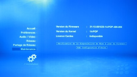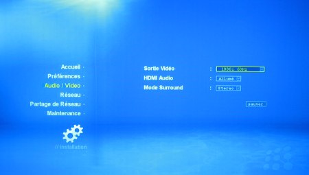 propose la sélection du mode vidéo (20 résolutions HDMI, 5 résolutions VGA), l’activation de la sortie audio sur port HDMI ainsi que la nature du signal envoyé via la prise HDMI (stéréo ou 5.1). On ne trouve plus de réglage spécifique par type de codage (par exemple mode de gestion du DTS).