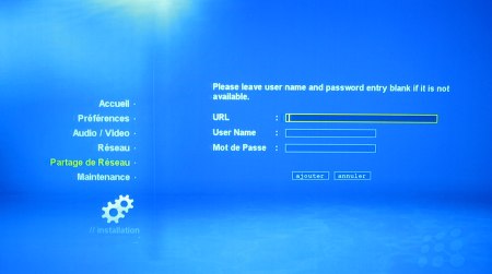Cette section permet de référencer des partages réseaux en naviguant dans les workgroups existants ou en saisissant leur adresse directement. Ce partage sera ajouté sur la page de sélection des sources.