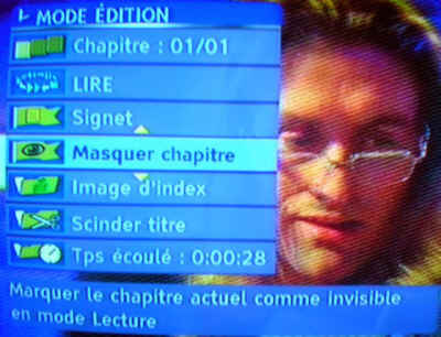 Des fonction d’édition (montage) minimales sont proposées. Vous pourrez supprimer un enregistrement, marquer des chapitres, les rendre invisibles par la suite (pour sauter une pub par exemple).