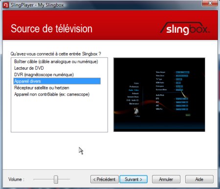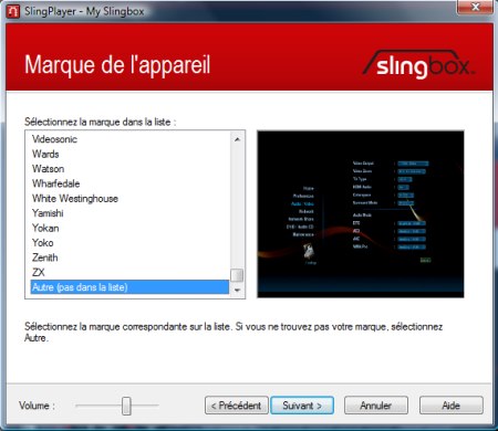 Dans le cas d’une autre source que le tuner interne, l’assistant demande de spécifier le type d’appareil connecté mais aussi d’en indiquer la marque et le modèle.