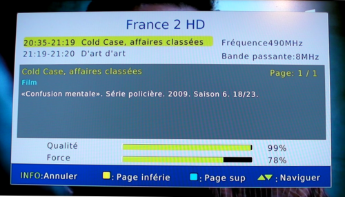 Un appuis sur la touche info de la télécommande fait apparaître le détail du programme en cours ainsi que la force/Qualité du signal numérique. Cela pourra aider pour un réglage fin de votre installation.