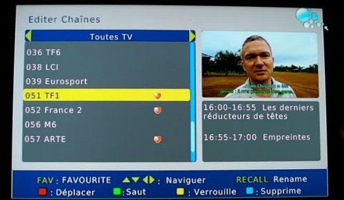La vitesse de zapping entre chaine est de l’ordre de une seconde. Un bandeau apparait en surimpression avec le nom du programme en cours, celui a venir ainsi que des petits logos pour indiquer la présence de pistes audio multiple et de sous-titrage. Ce bandeau OSD pourrait être plus esthétique avec par exemple un effet de transparence..