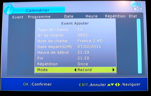 Autre source de frustration, la programmation sera par défaut en mode voir ce qui signifie que le décodeur s’allumera et se positionnera sur la chaine seulement. Il aurait été plus judicieux de le positionner par défaut sur le choix Enregistrement !
