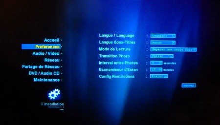 La première section, Préférences, permet de choisir la langue d’utilisation, la langue de sous-titrage ou encore le mode et temps de transition pour les diaporamas Photo.