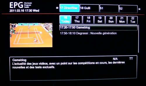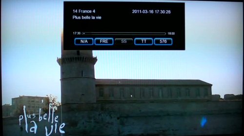 - Lors de la sélection d’une chaine, un bandeau apparait avec des informations de guide des programmes. Le zapping prend de l’ordre de deux secondes.