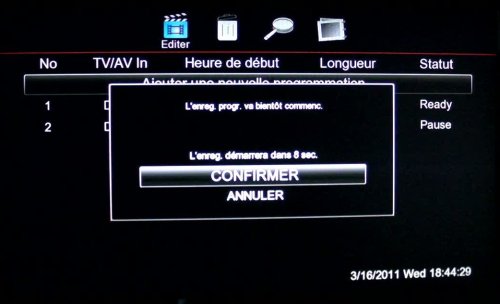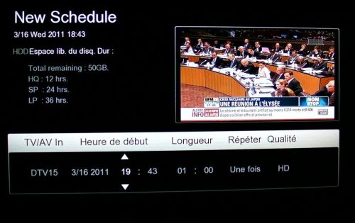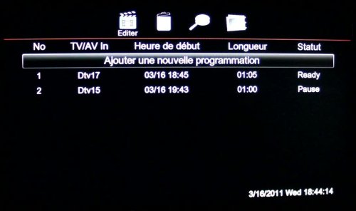 On y entre le canal à enregistrer, la date, l’heure la durée ainsi que le type de répétition (hebdomadaire, quotidien).