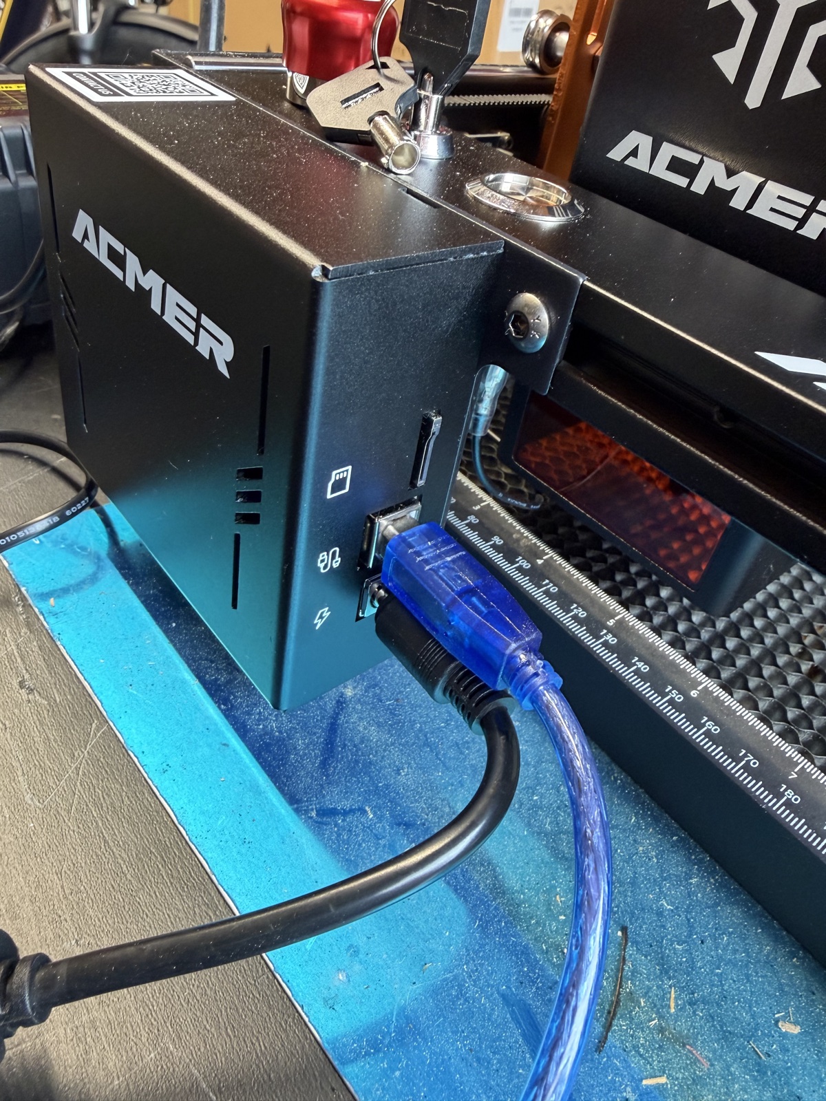 Pour la découpe, l’assistance à air est essentielle. Celle de chez ACMER est alimentée et pilotée par la machine/logiciel. Je la trouve plus bruyante et mobile que celles de chez Creality. Elle fait néanmoins le travail pour améliorer la combustion et chasser les fumées.