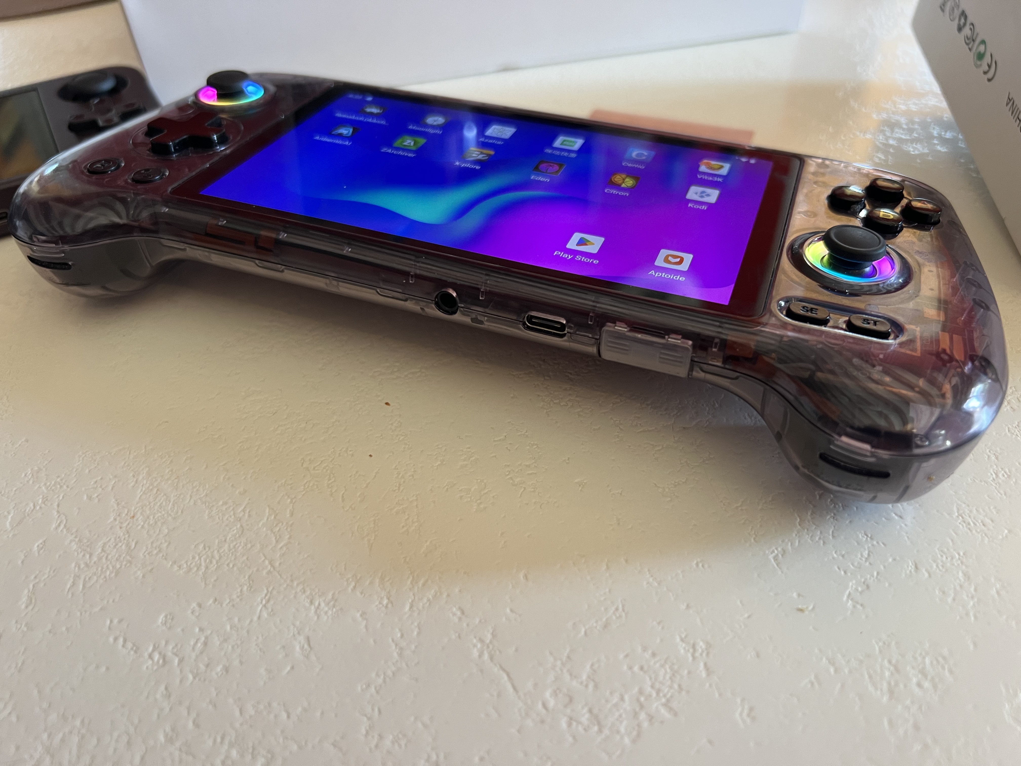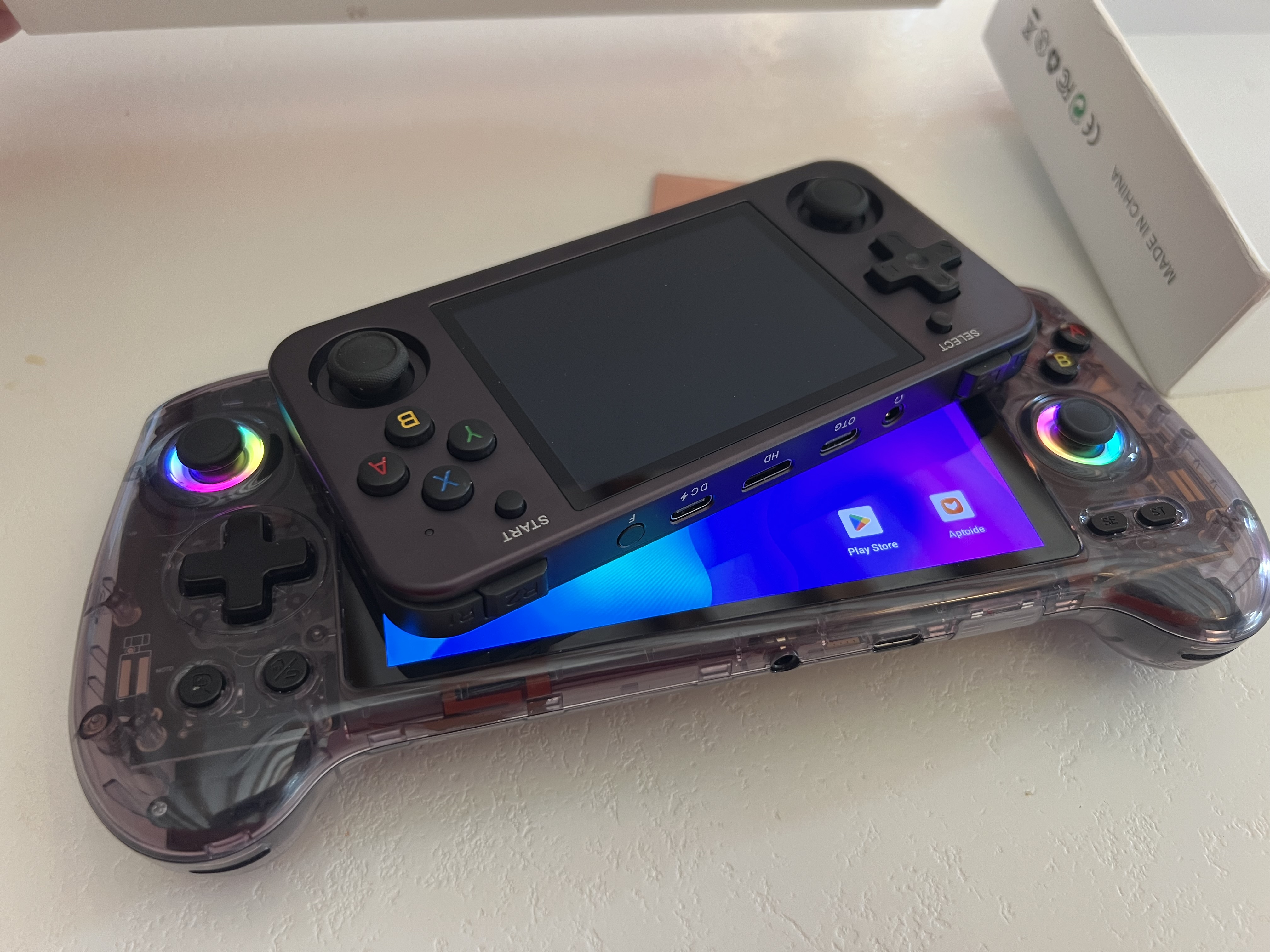 Beaucoup des précédentes consoles Anbernic fonctionnaient sous Linux avec GarlicOS, parfois associé à Android en dual boot. La RG557 fait un autre choix et embarque exclusivement Android 14, la toute dernière version du système. La console bénéficie d’un accès complet au Play Store, un véritable atout pour installer facilement des jeux et applications. Le système n’est pas rooté mais reste personnalisable via ADB.