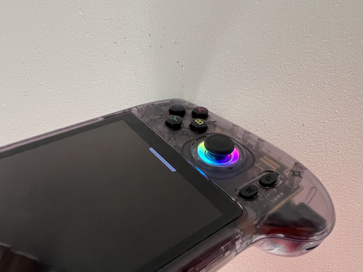 • Deux sticks analogiques : compacts et proches de la taille de ceux des Joy-Con de la Nintendo Switch, ils seront donc familiers aux joueurs venant de cet univers. Pour les autres, un petit temps d’adaptation peut être nécessaire pour trouver la précision optimale. Anbernic fournit d’ailleurs des capuchons en silicone pour augmenter légèrement leur hauteur et améliorer la prise en main. Ils profitent d’un éclairage LED si vous le souhaitez.