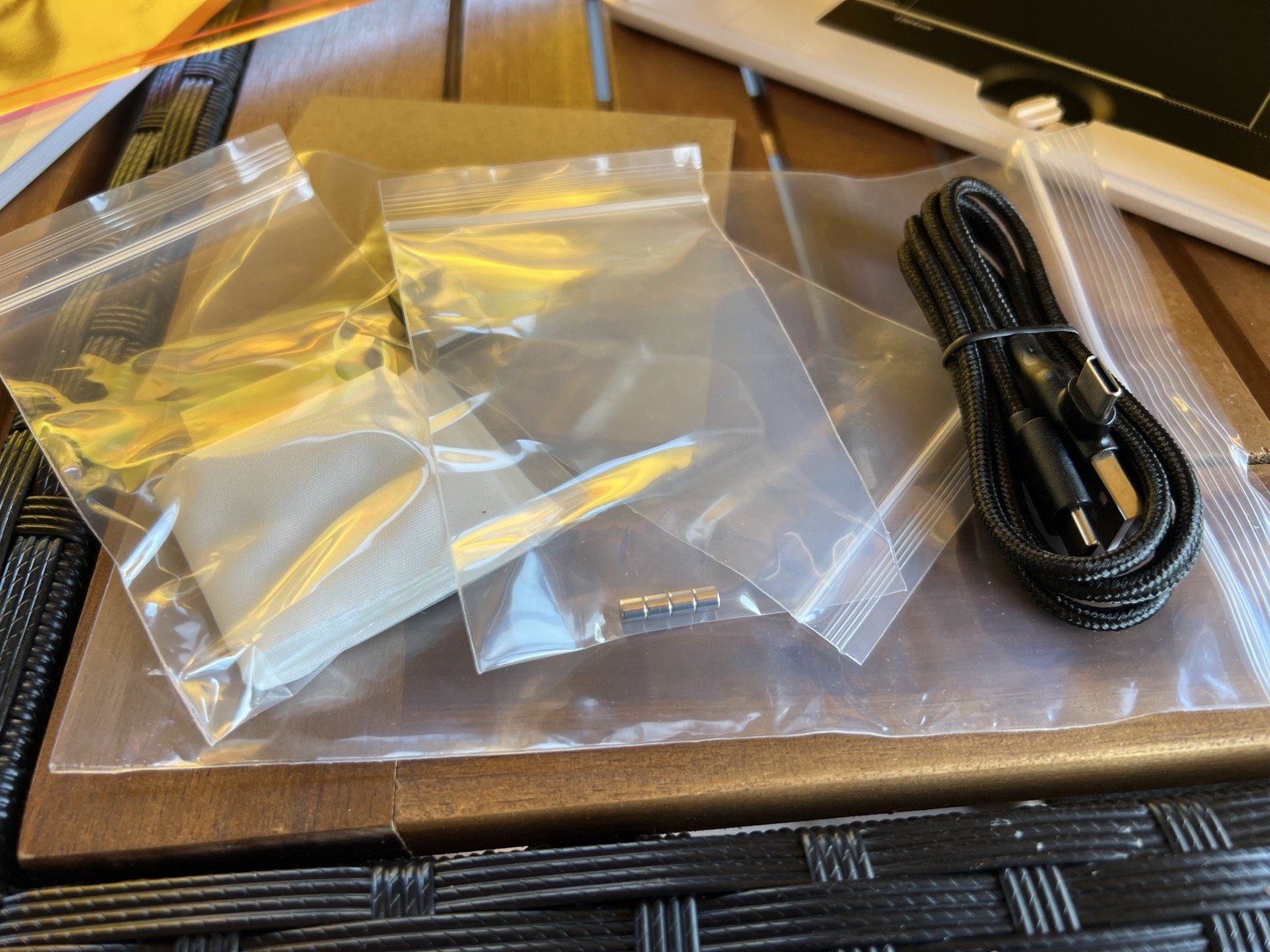 Dans la boite se trouvent un câble USB astucieux, compatible USB-A et USB-C, un manuel, quatre aimants pour bloquer vos objets si besoin, un échantillon de MDF, un chiffon doux, une clé USB de stockage et une seconde, qui est en réalité un dongle de sécurité.