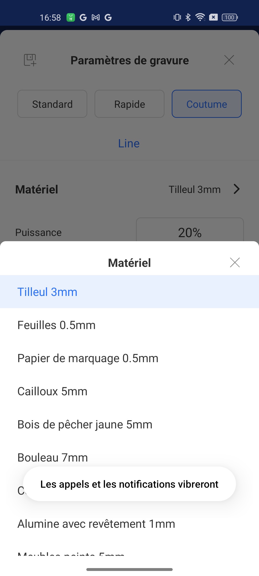 Le bois (contreplaqué, bambou), le cuir, le simili cuir, ou encore l’ardoise se gravent sans difficulté à environ 5000-7000 mm/min à 90% de puissance.