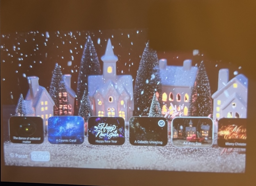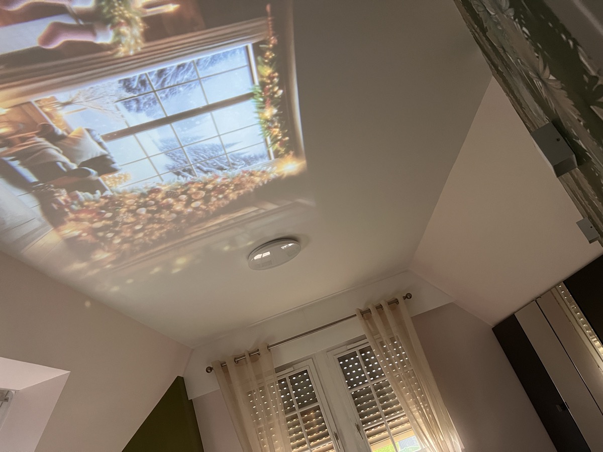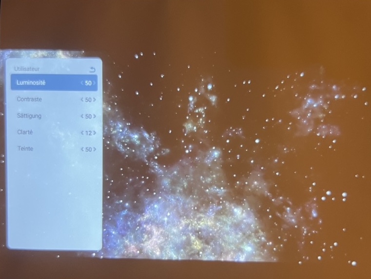 Il faut aussi mentionner la fonction Ciel étoilé. Il s’agit de vidéos intégrées dans le projecteur, diffusées de préférence sur le plafond, qui recréent des ambiances de nuit étoilée ou des vidéos d’atmosphère (Noël, Nouvel An, etc.).