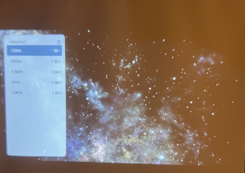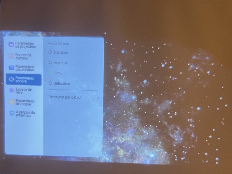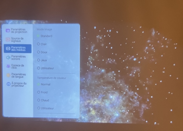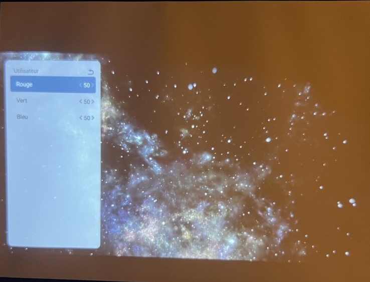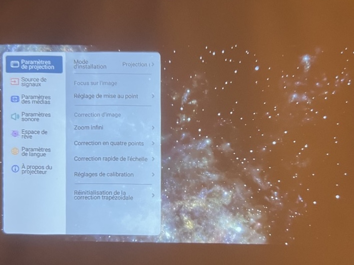 Ces réglages de projection sont accessibles depuis un menu dédié, via un raccourci sur la télécommande.