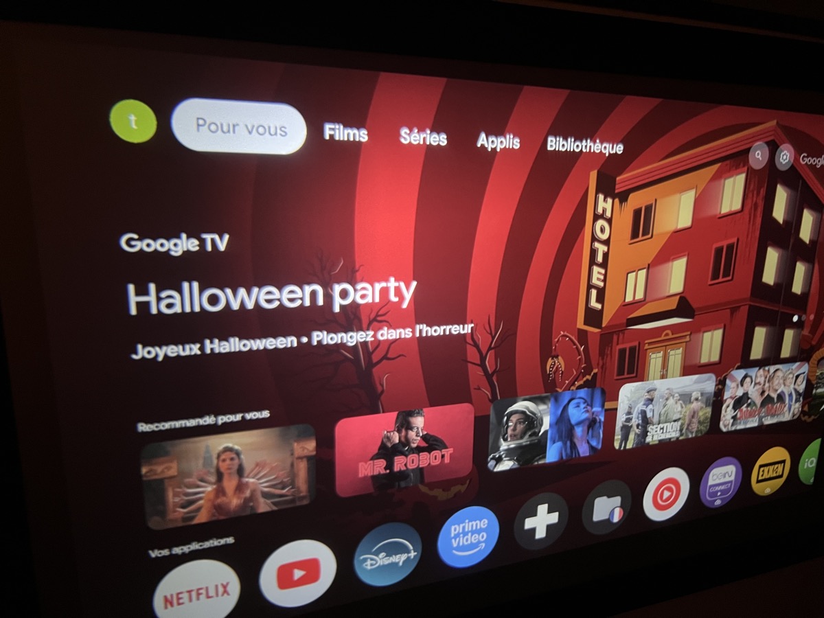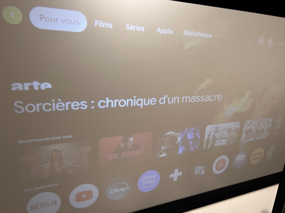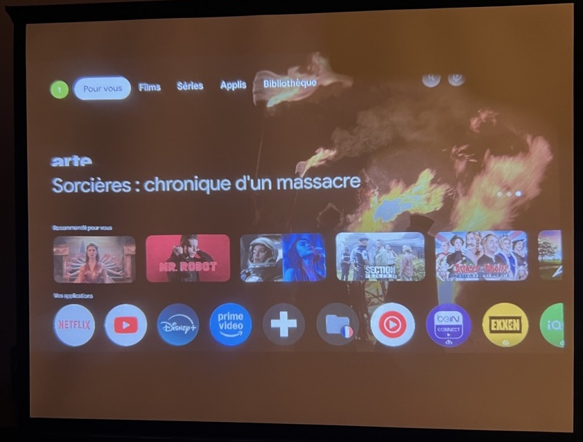 Inutile de connecter une source vidéo pour la plupart des usages : le projecteur est animé par Android TV 12 et utilise l’interface utilisateur Google TV. Le système d’exploitation est certifié par Netflix et Google, disposant ainsi des DRM nécessaires pour diffuser des contenus en haute définition (L1) ou au-delà. Toutes les applications de streaming et bien d’autres sont disponibles dans le catalogue d’applications.