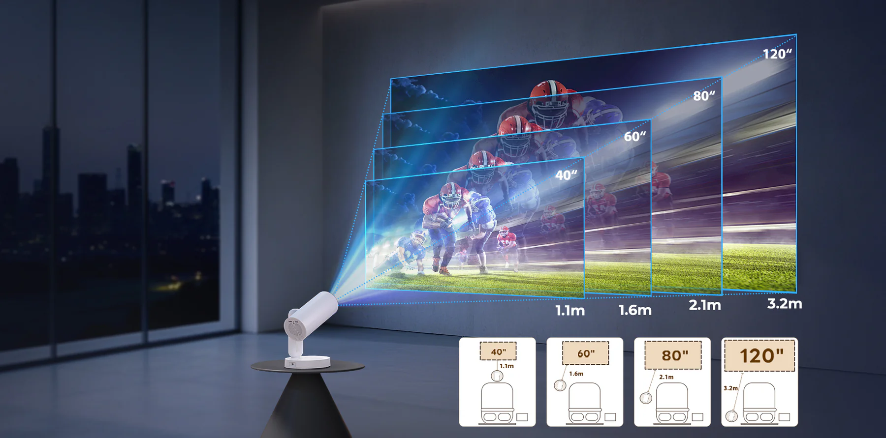 La taille de l’image dépend du recul disponible. Avec un rapport de projection de 1,18:1, vous obtenez une image de 40 pouces à 1,1 mètre de distance, 60 pouces à 1,8 mètre, 80 pouces à 2,2 mètres et 120 pouces à 3 mètres. Si vous projetez sur un plafond avec un léger angle depuis une table de chevet, vous obtenez très facilement une image d’environ 80 pouces.