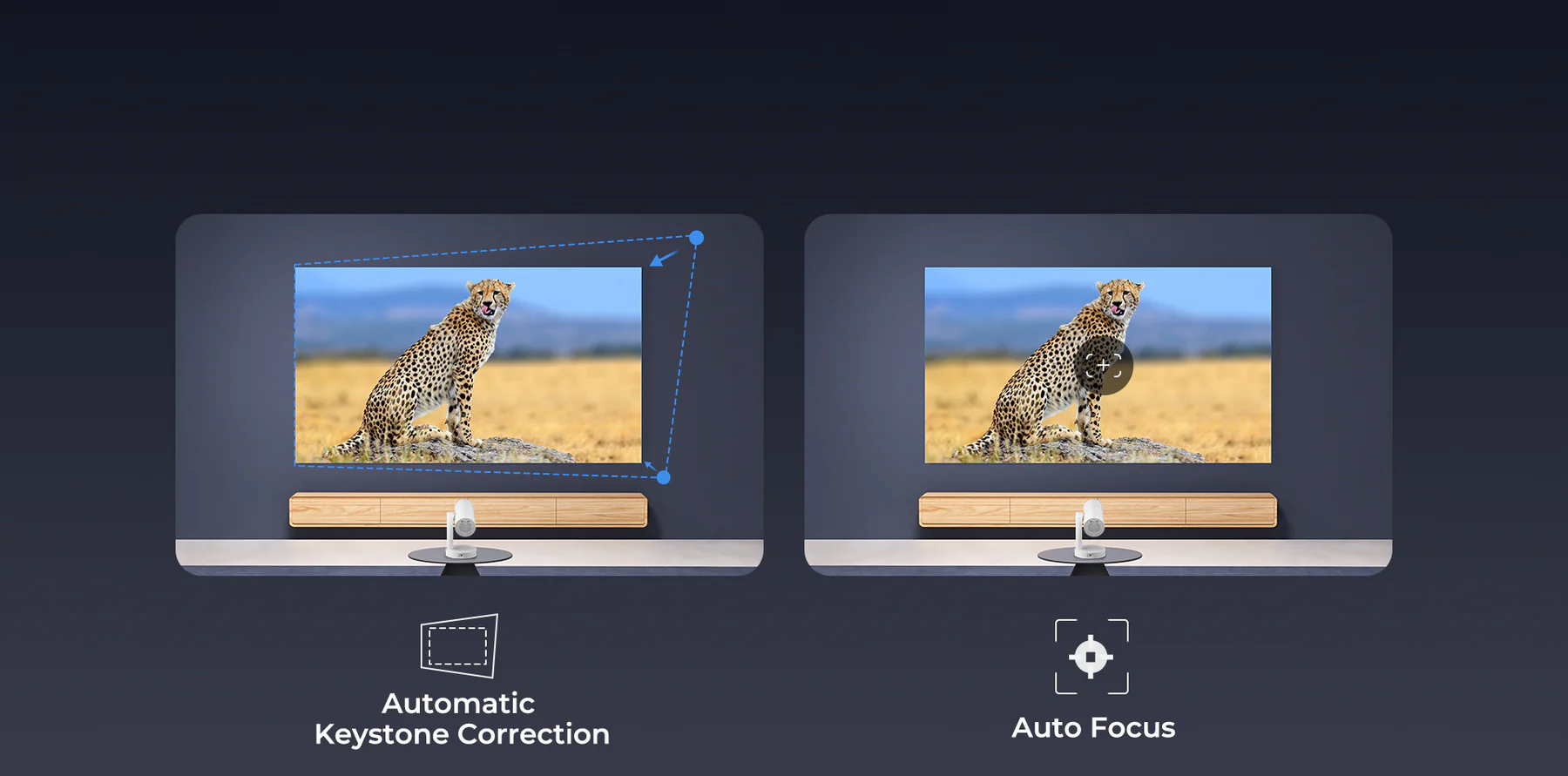 Le projecteur ajuste automatiquement la netteté ainsi que la correction de trapèze, mais uniquement sur l’axe vertical. En d’autres termes, si vous orientez le projecteur vers le haut ou vers le bas, le Starfish Plus redressera automatiquement l’image.