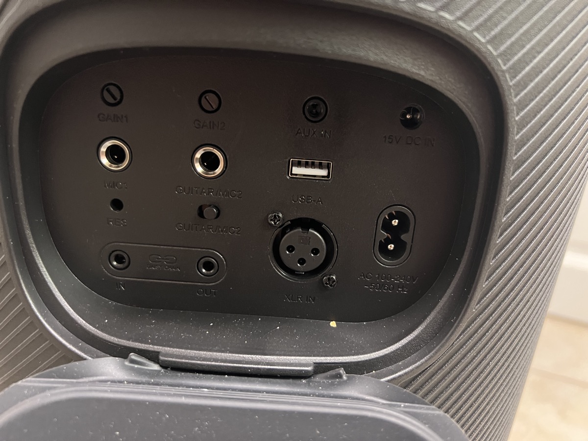 Derrière un rabat de protection en caoutchouc se trouve la connectivité physique de l’enceinte.