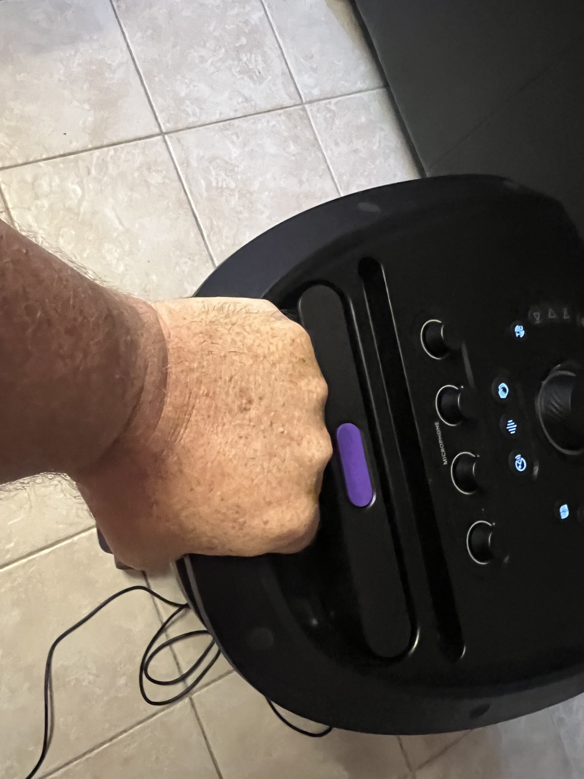 La seconde section du panneau comprend trois boutons d’effets sonores (acclamations, klaxon de DJ, applaudissements). Leur intérêt reste limité : contrairement au “Partypad” des JBL PartyBox, il n’est pas possible de personnaliser les sons, et la musique ou le micro se coupe dès qu’un effet est déclenché.