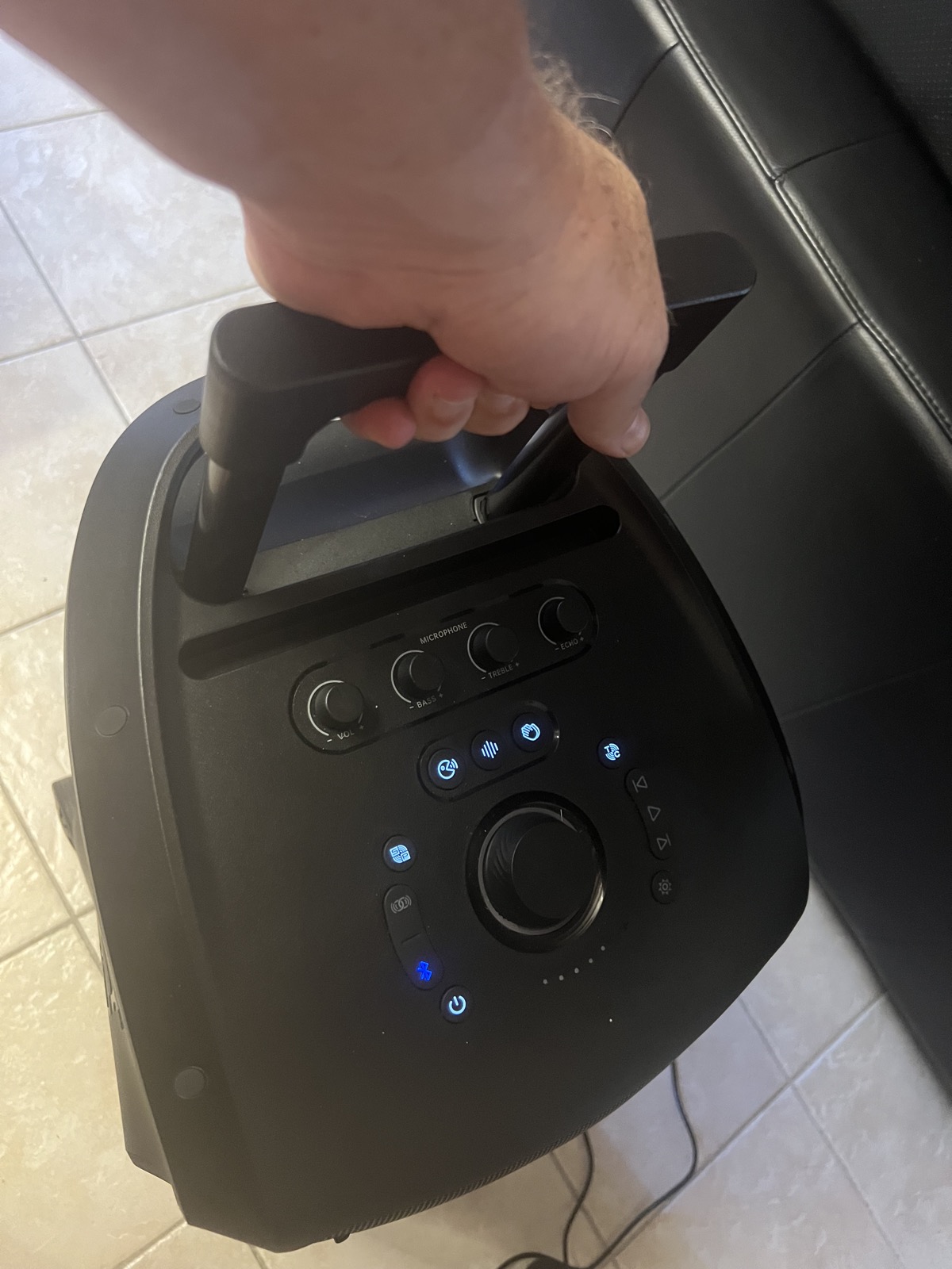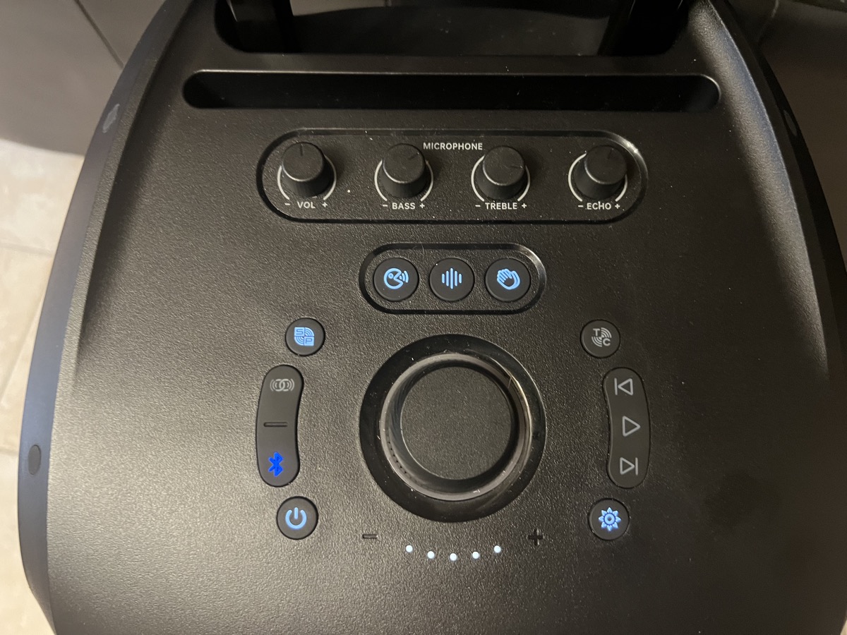 Un dernier bouton sert à contrôler l’éclairage LED en façade, avec cinq modes possible. Une indication du niveau de batterie est visible. Lors de l’ajustement du volume, le niveau est visuel par une couronne autour des HP en façade.