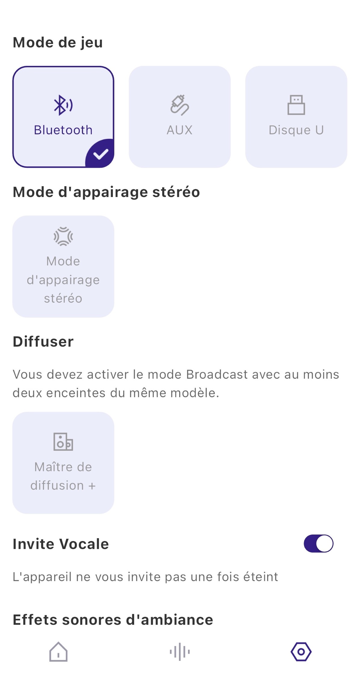 Côté éclairage, l’application permet de choisir rapidement parmi cinq ambiances lumineuses. Il est possible aussi de changer ces modes en pressant le bouton de changement sur l’enceinte.