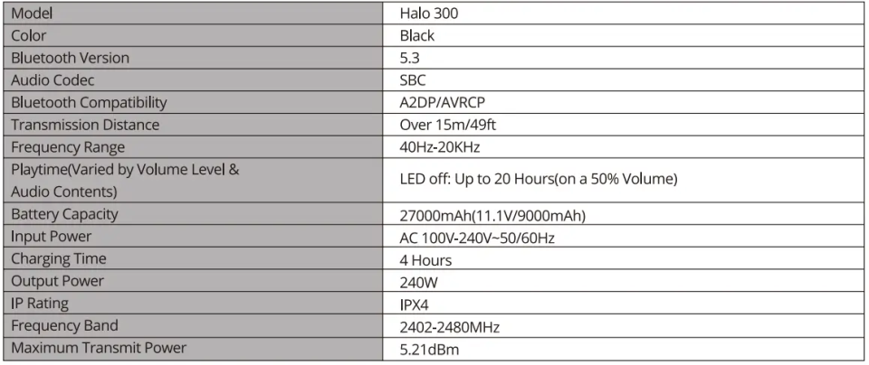 La Halo 300 est livrée avec une housse de protection basique. Il est possible de trouver sur Aliexpress de quoi la protégrer mieux si vous n’utilisez pas son carton de transport. La Halo 300 est certifiée IPX4, ce qui la protège contre la poussière et les éclaboussures pour un usage en exterieur.