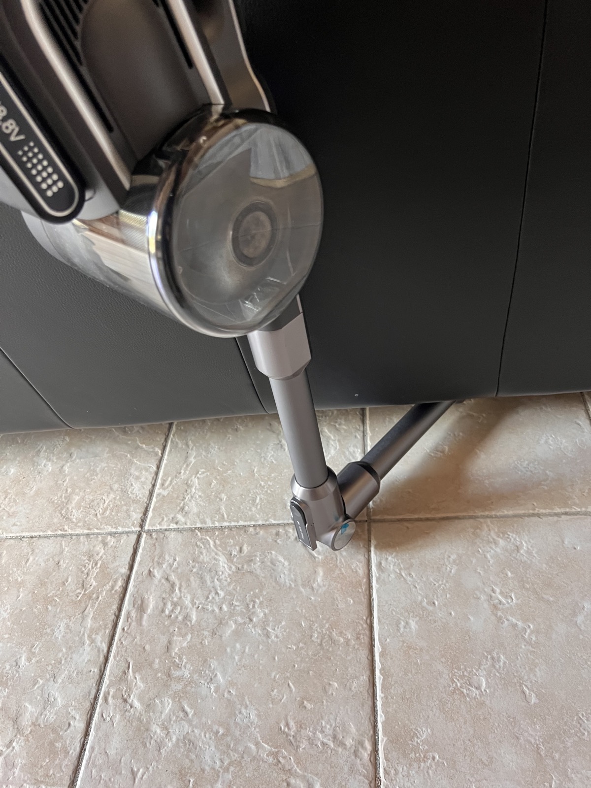 Le système de pliage est simple, via un simple bouton à presser situé sur sa face inférieure. Le tube métallique se plie jusqu’à un angle maximal de 90 degrés. Cette fonctionnalité est un point fort majeur de ce modèle. Elle permet d’accéder facilement et sans avoir à se baisser sous les meubles, les lits ou canapés. Même coudé, les brosses continuent à être alimentées.