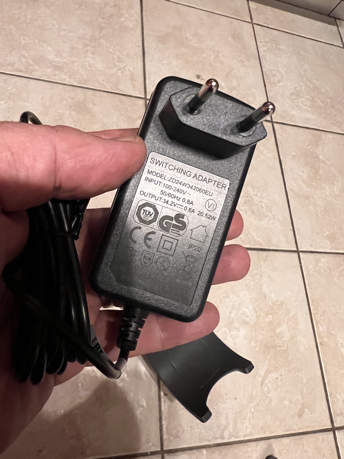 L’adaptateur fourni sort du 34,2V en 0,8 Ah soit 20,52W.