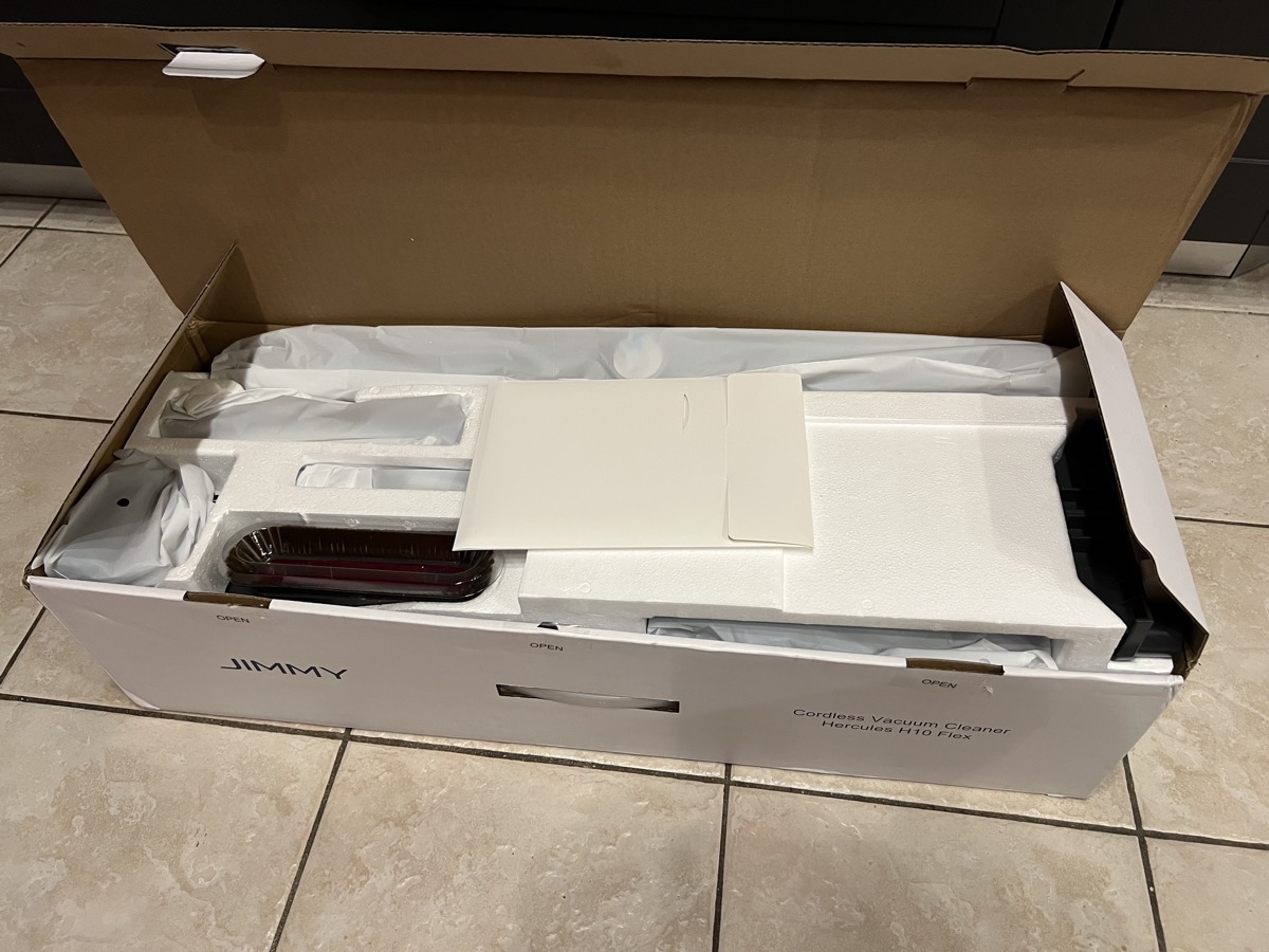 L’aspirateur Jimmy H10 Flex est livré dans une boîte bien optimisée niveau rangement.