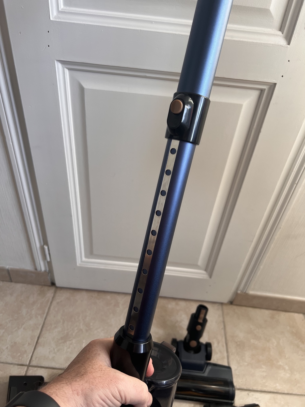 Le tube est rétractable ce qui permet d’ajuster la hauteur de travail. C’est un choix ergonomique intéressant qui n’est cependant pas compatible avec un système coudable pour aller sous les canapés.