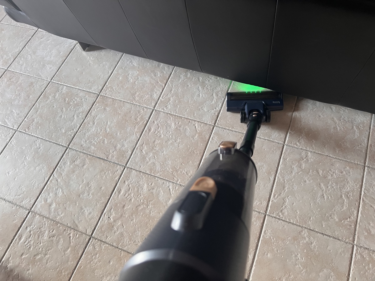 Elle intègre un éclairage LED vert à l’avant, fonction de plus en plus courante pour repérer poussières et poils, bien que sa luminosité reste inférieure à celle du Jigoo V700 qui est ma référence à ce sujet.