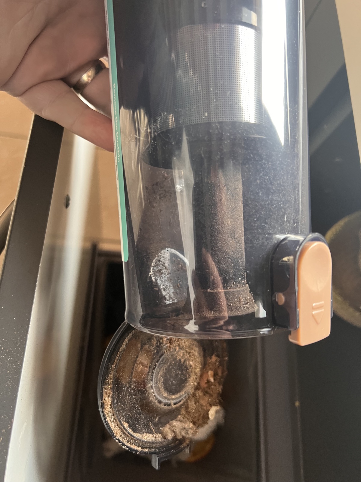 Le vidage du bac à poussière de 0,5 L se fait sans prise de tête : un simple appui sur le bouton ouvre la trappe pour un rejet direct dans la poubelle, évitant tout contact avec les saletés. Le réservoir reste adapté à un usage quotidien sans nécessiter de vidanges fréquentes.