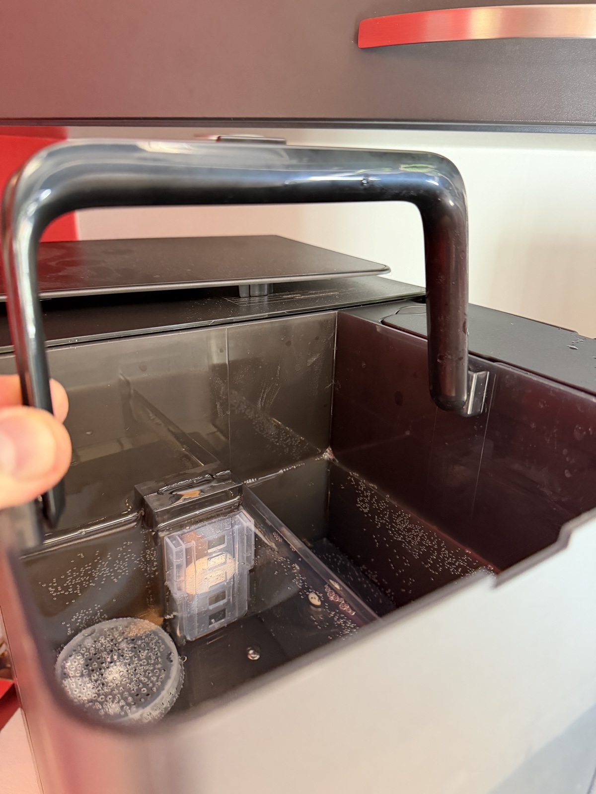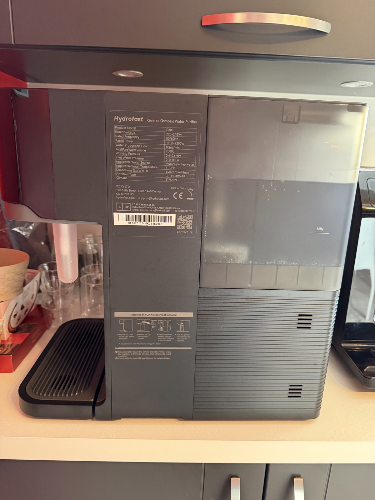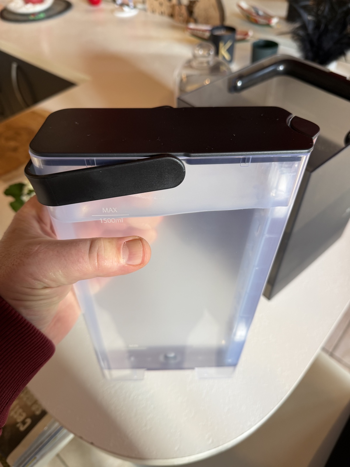 Si, comme moi, vous avez des meubles en hauteur dans votre cuisine au-dessus du plan, cela pourra être un peu plus compliqué pour vider/recharger le réservoir en eau.