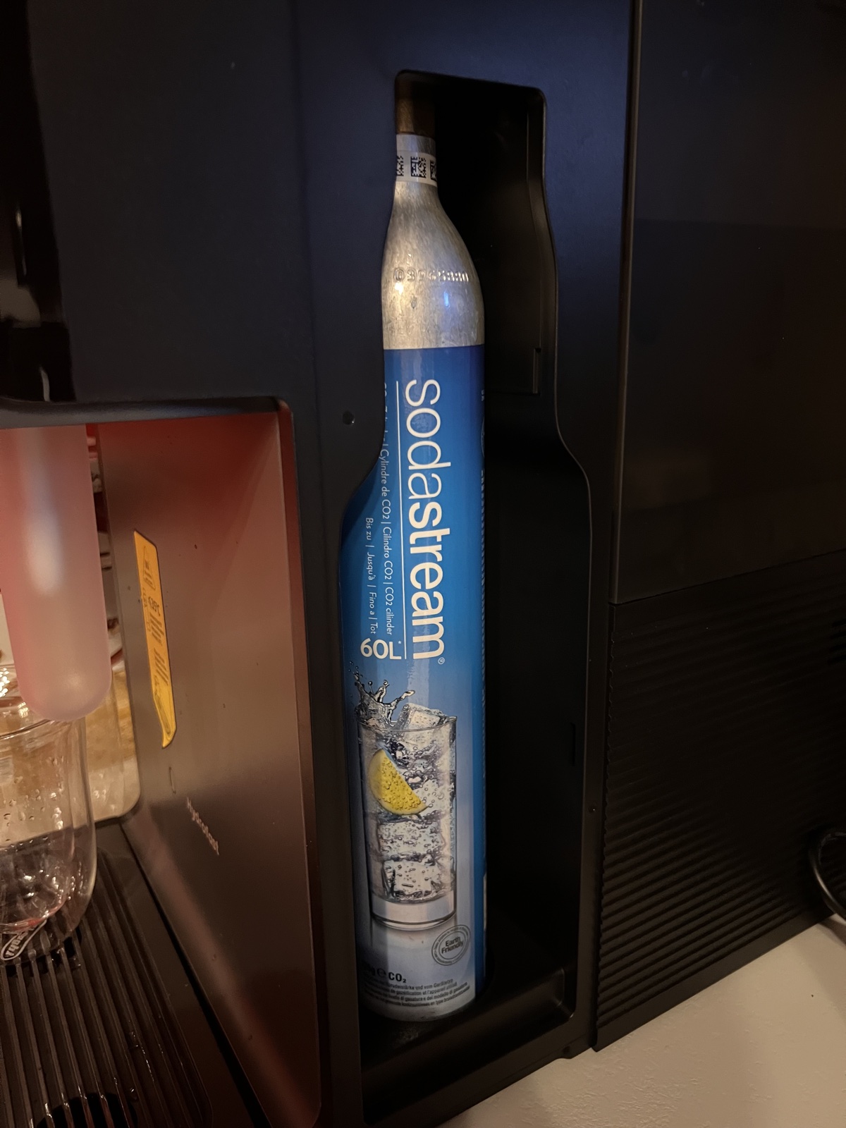Le constructeur ne fournit pas de cylindre mais par chance c’est un modèle universel. Vous pouvez acheter une recharge CO2 SodaStream bleu, Philips, Brita, Carrefour ou Auchan (QILIVE).