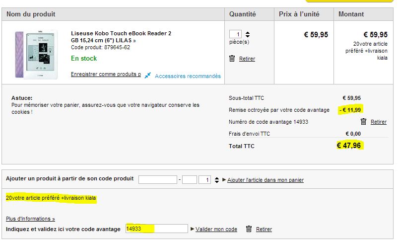 - Le modèle Kobo Touch avec arrière Lila est en soldes à 59€95