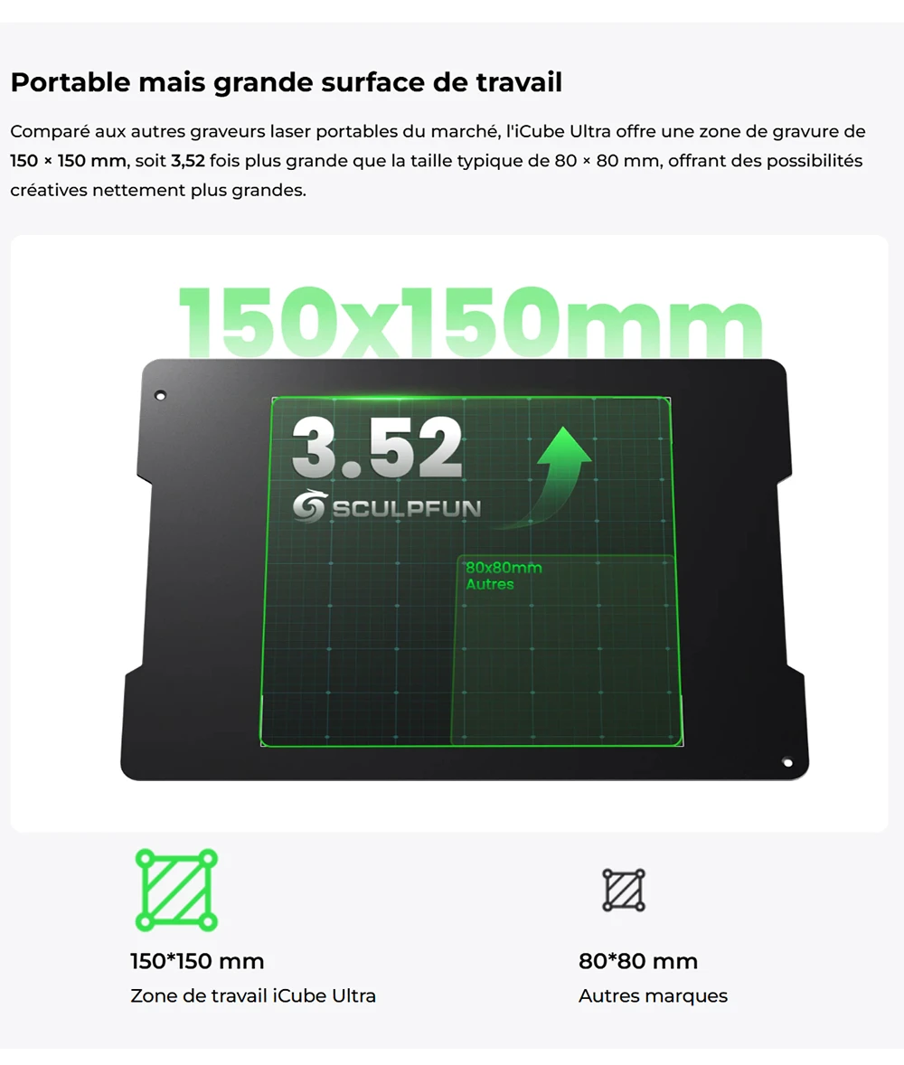 L’un des atouts majeurs de cette nouvelle version ULTRA réside dans sa surface de gravure de 150 x 150 mm, supérieure à la concurrence directe où la plupart des modèles plafonnent à 100 mm de côté.