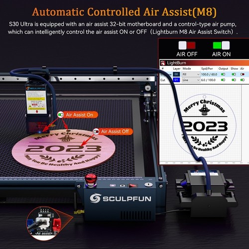 Lightburn devient vite incontournable, car il est le seul à pouvoir piloter le déclenchement de la pompe pour l’Air assist de manière automatique.